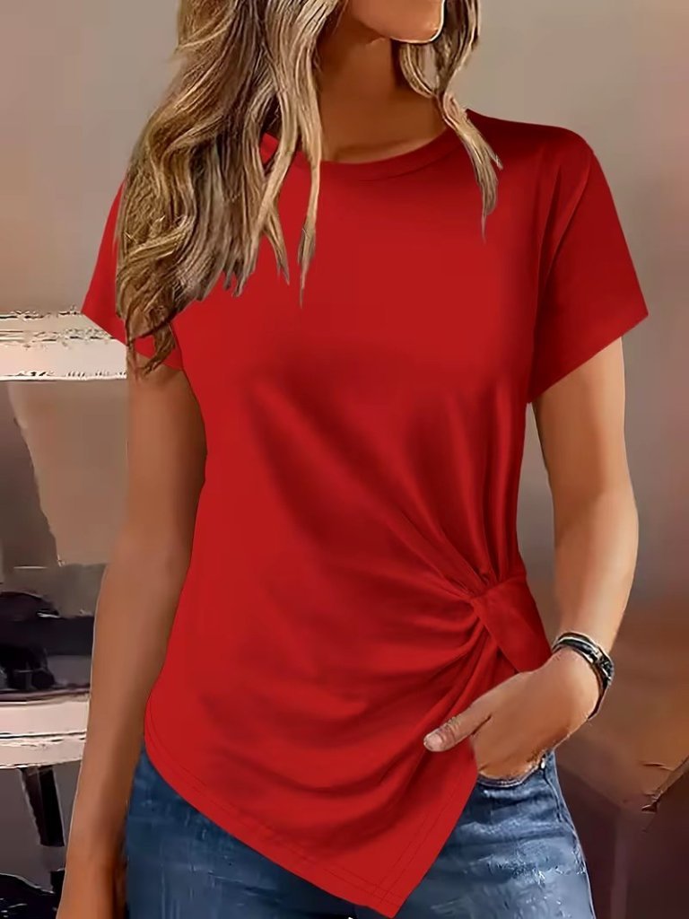Kadın Kısa Kollu Bisiklet Yaka Asimetrik Kesim Detaylı Viskon Bluz Modelin Ölçüleri: Boy:165, Kg:55, Göğüs:90, Bel:72, Kalça: 100 Modelin üzerindeki ürün M/38 bedendir DESEN-DiğerleriKALIP-Asimetrik