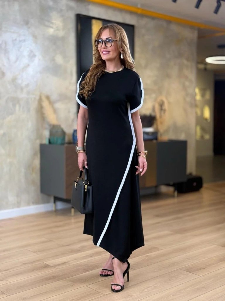 Kadın Kısa Kollu Bisiklet Yaka çift şerit Renk Detaylı Asimetrik Kesim Viskon Iki Iplik Elbise