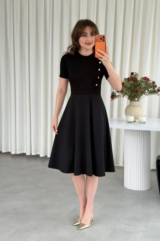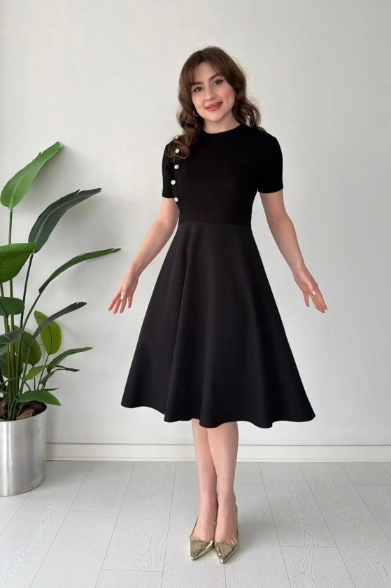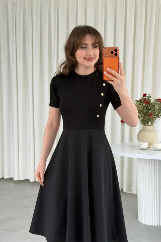 Kadın Kısa Kollu Bisiklet Yaka Gold Düğme Detay Midi Boy Elbise