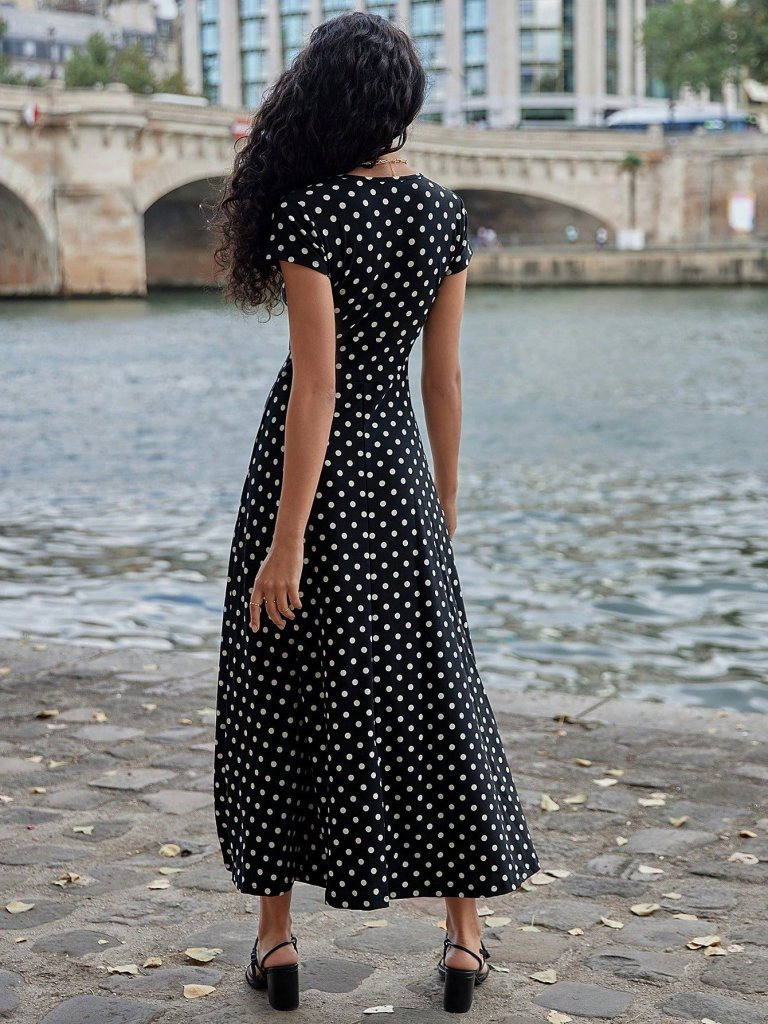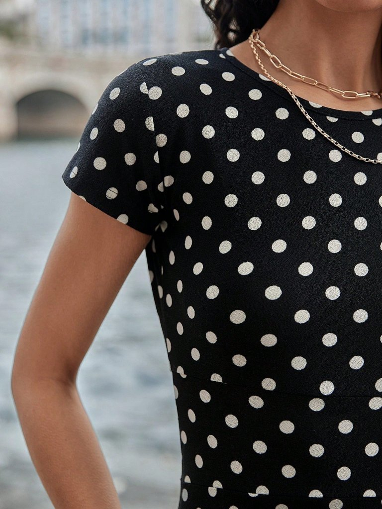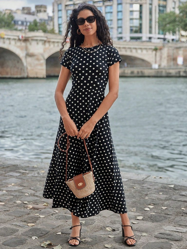 Kadın Kısa Kollu Bisiklet Yaka Puantiyeli Maksi örme Krep Elbise