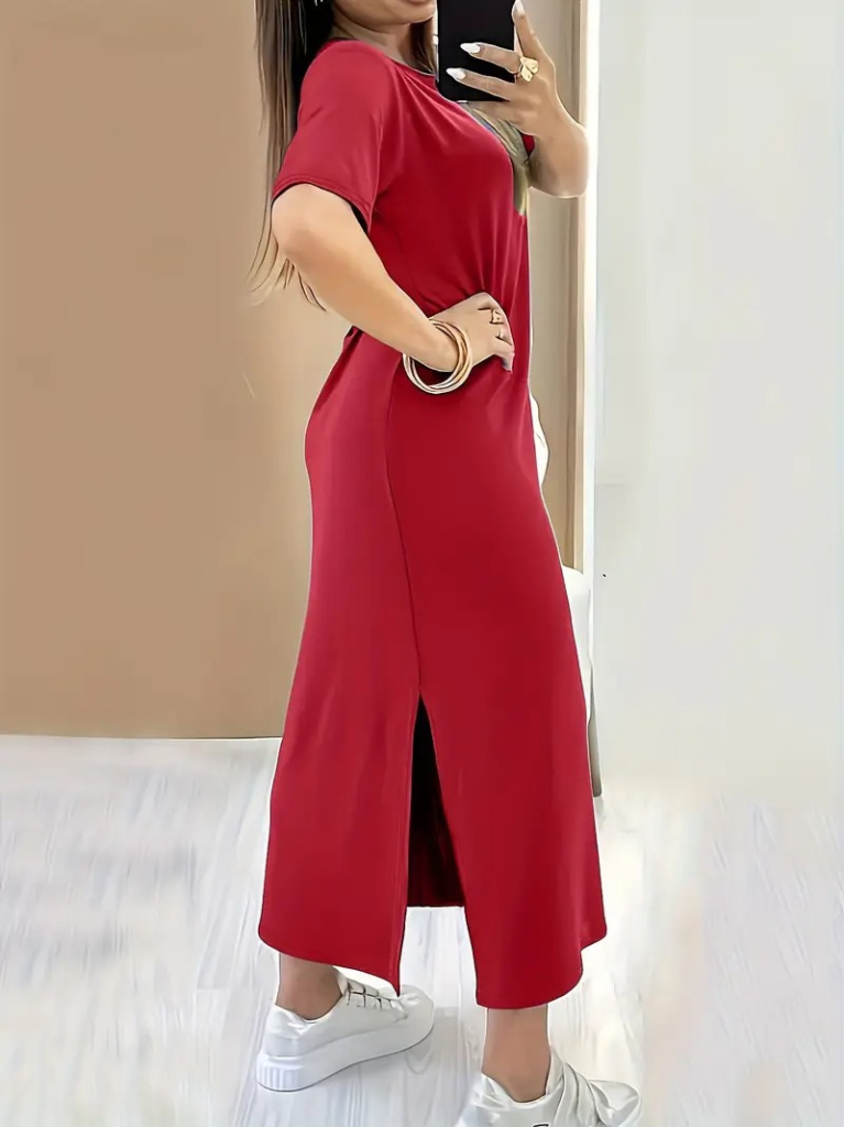 Kadın Kısa Kollu Bisiklet Yaka Yandan Yırtmaçlı Viskon Elbise