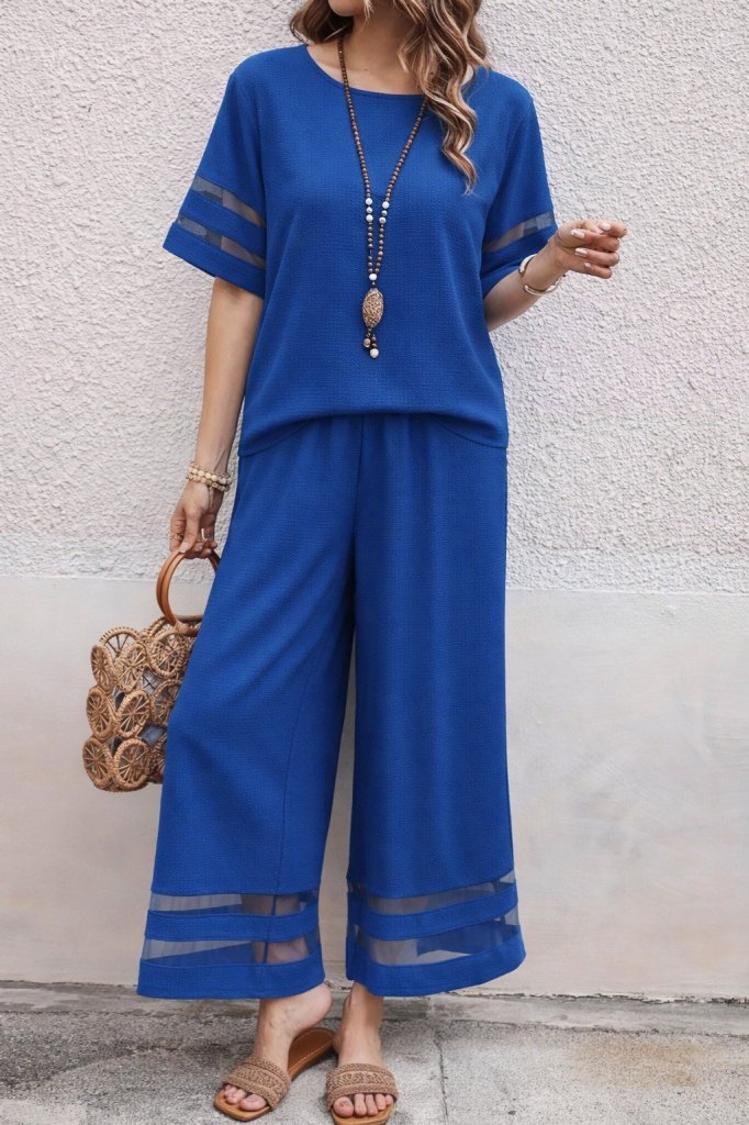 Kadın Kısa Kollu Bisiklet Yakalı Tül şerit Detaylı Bluz Ve Pantolon Ikili Takım