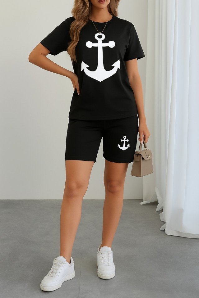 Kadın Kısa Kollu çapa Baskılı Viskon Ikili Takım