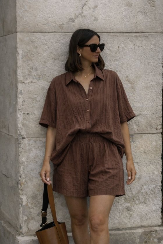 Kadın Kısa Kollu çizgili Modal Kumaş Gömlek Ve Yüksek Bel Lastik Detay şort Ikili Takım Modelin Ölçüleri: Boy:165, Kg:55, Göğüs:90, Bel:72, Kalça: 100 Modelin üzerindeki ürün M/38 bedendir
