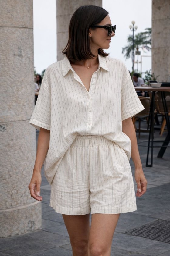 Kadın Uzun Kollu Salaş Gömlek Ve şort Keten Ikili Takım