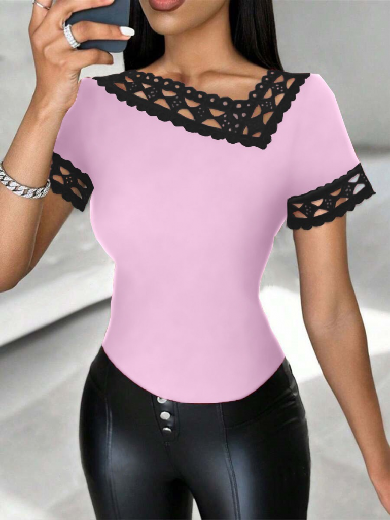 Kadın Kısa Kollu Dantel Yaka Viskon Bluz