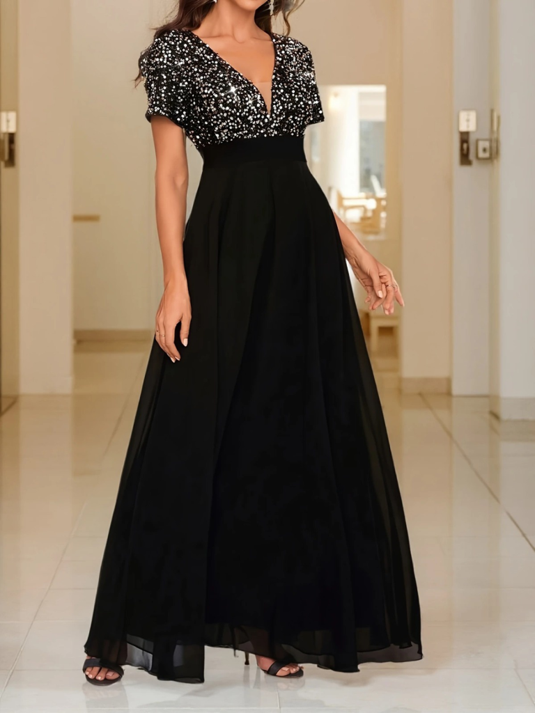 Kadın Kısa Kollu Derin V Yakalı A Kesim Pulpayet Detaylı şifon Nedime Elbisesi