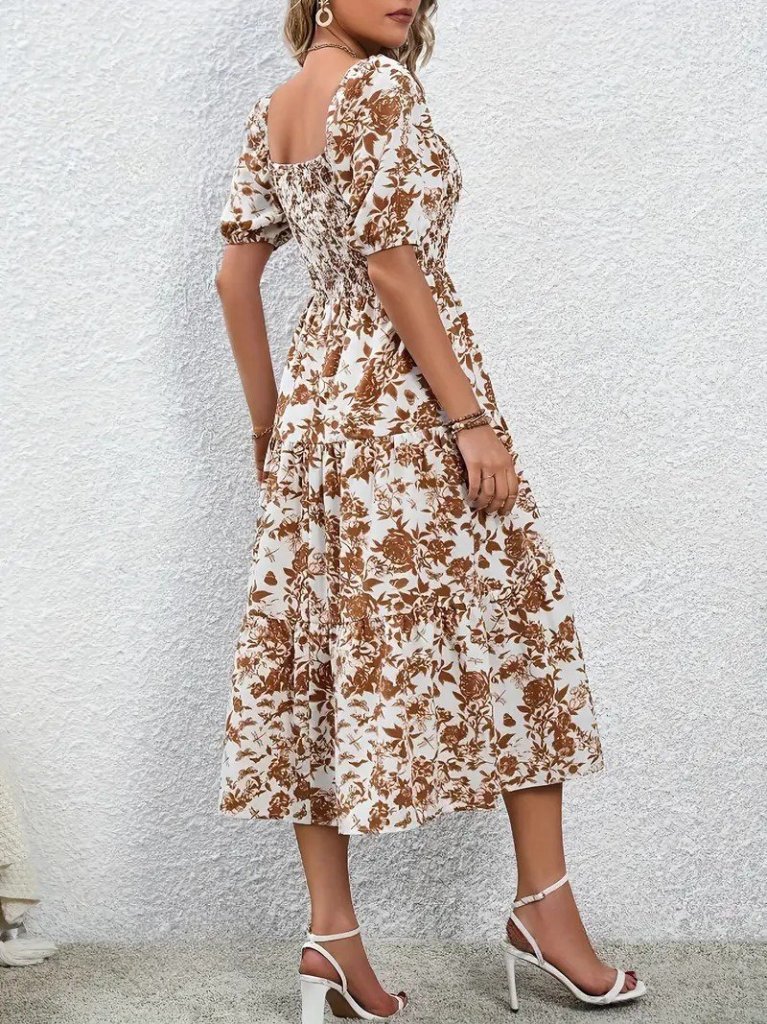 Kadın Kısa Kollu Kare Yakalı Lastikli Desenli Süprem Elbise