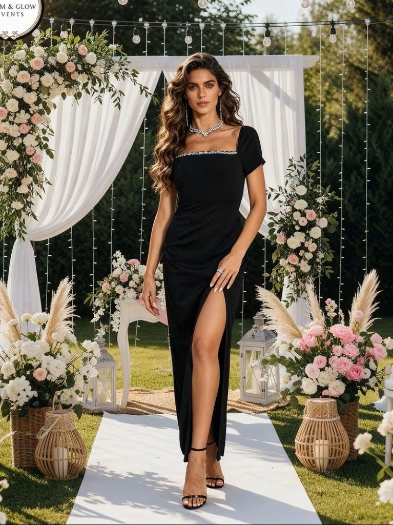 Kadın Kısa Kollu Kare Yakalı Sim Detaylı Arkadan Bağcıklı Yırtmaçlı Uzun Ithal Krep Elbise