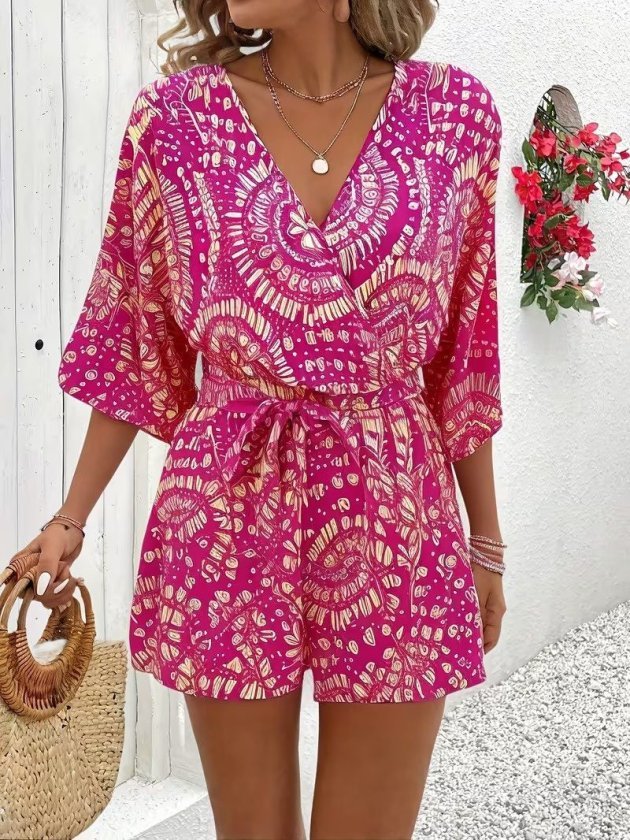 Kadın Kısa Kollu Kruvaze Yakalı Belden Kuşaklı Desenli Kısa Süprem Tulum Modelin Ölçüleri: Boy:165, Kg:55, Göğüs:90, Bel:72, Kalça: 100 Modelin üzerindeki ürün M/38 bedendir YAKA-KruvazeKOL UZUNLUK-Kısa KolBACAK BOYU-Kısa