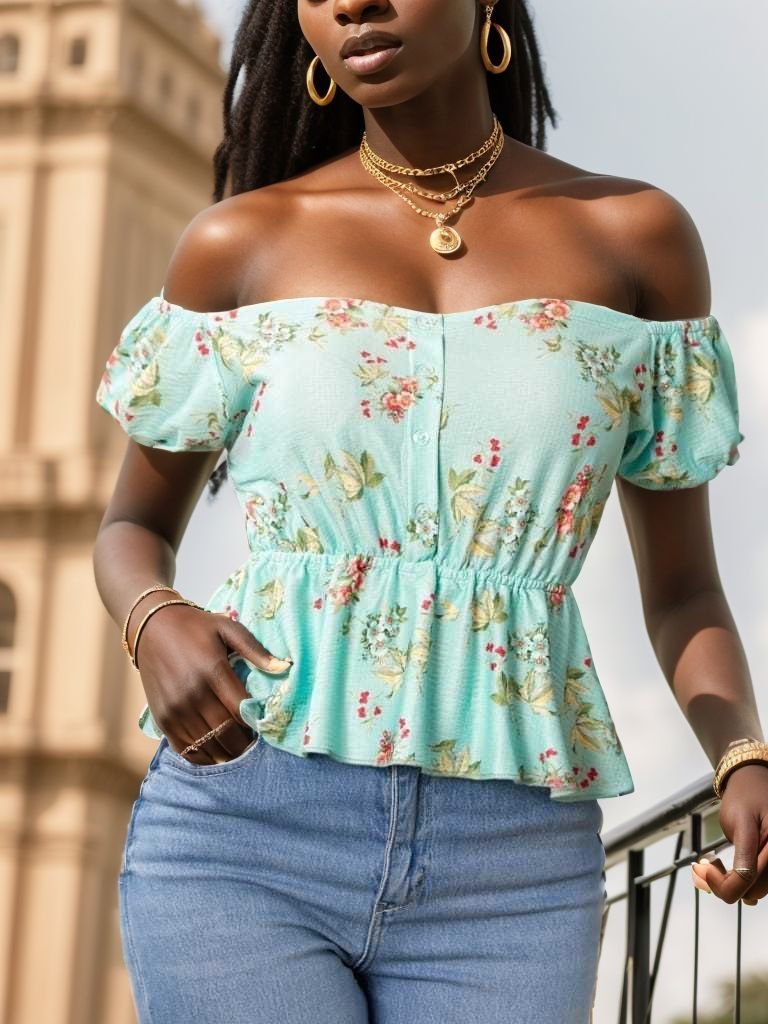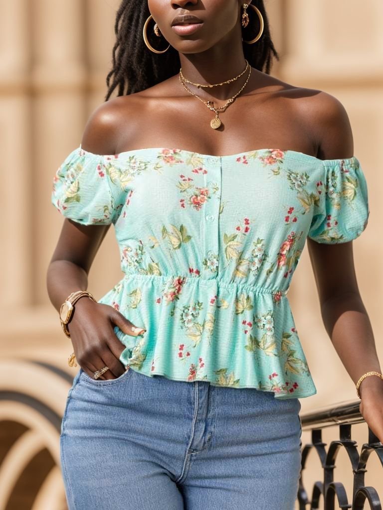 Kadın Kısa Kollu Madonna Yaka çiçek Desenli Düğme Detay Gipeli Süprem Kumaş Bluz Modelin Ölçüleri: Boy:165, Kg:55, Göğüs:90, Bel:72, Kalça: 100 Modelin üzerindeki ürün M/38 bedendir DESEN-Çiçek DesenKALIP-Sırtı Açık
