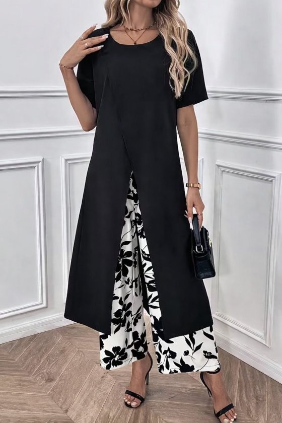 Kadın Kısa Kollu önden çapraz Detaylı Viskon Uzun Bluz Ve Desenli Iki Iplik Pantolon Ikili Takım