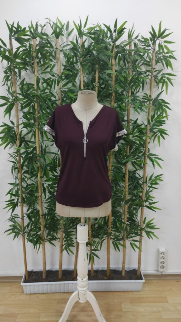 Kadın Kısa Kollu önden Fermuarlı Kol Ucu ışıltılı Viskon Bluz Modelin Ölçüleri: Boy:165, Kg:55, Göğüs:90, Bel:72, Kalça: 100 Modelin üzerindeki ürün M/38 bedendir DESEN-DiğerleriKALIP-Klasik