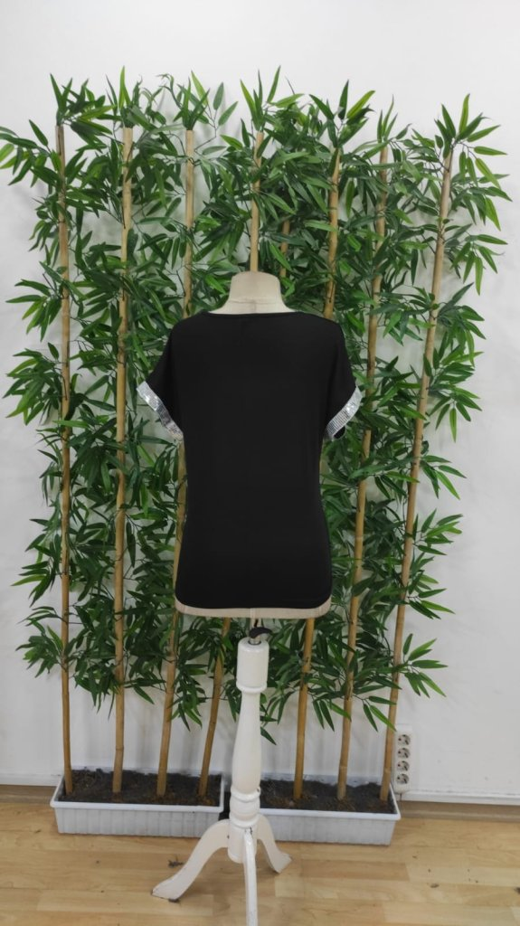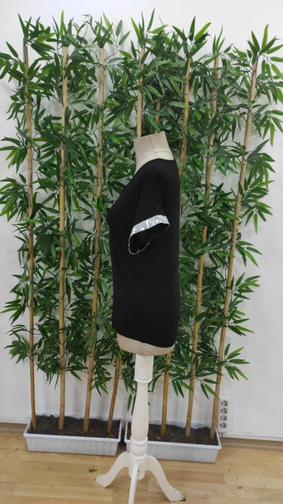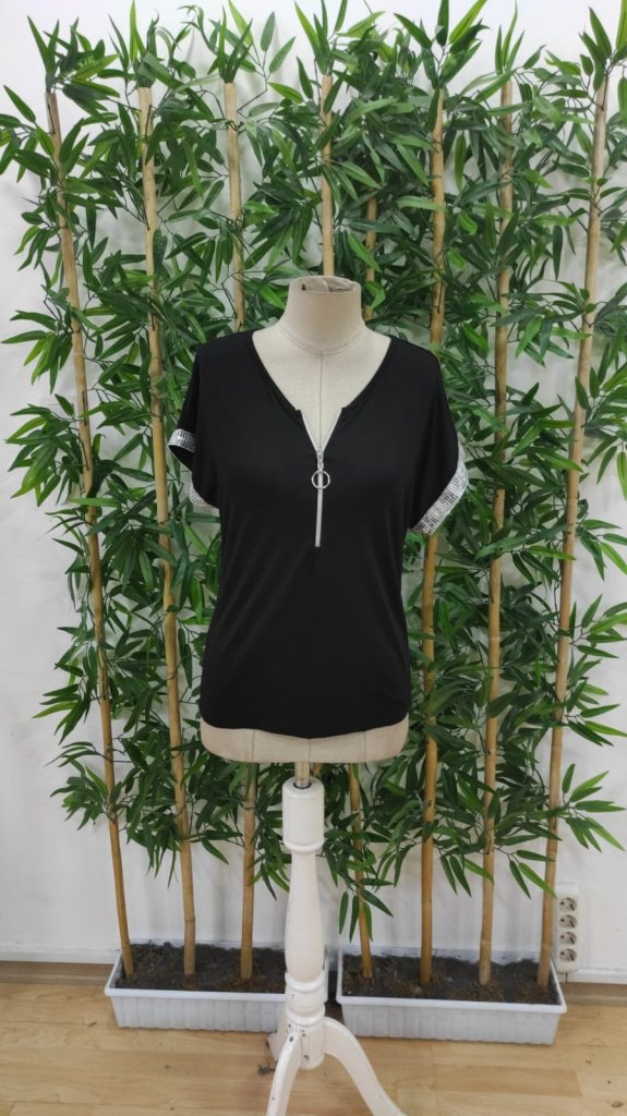 Kadın Kısa Kollu önden Fermuarlı Kol Ucu ışıltılı Viskon Bluz Modelin Ölçüleri: Boy:165, Kg:55, Göğüs:90, Bel:72, Kalça: 100 Modelin üzerindeki ürün M/38 bedendir DESEN-DiğerleriKALIP-Klasik