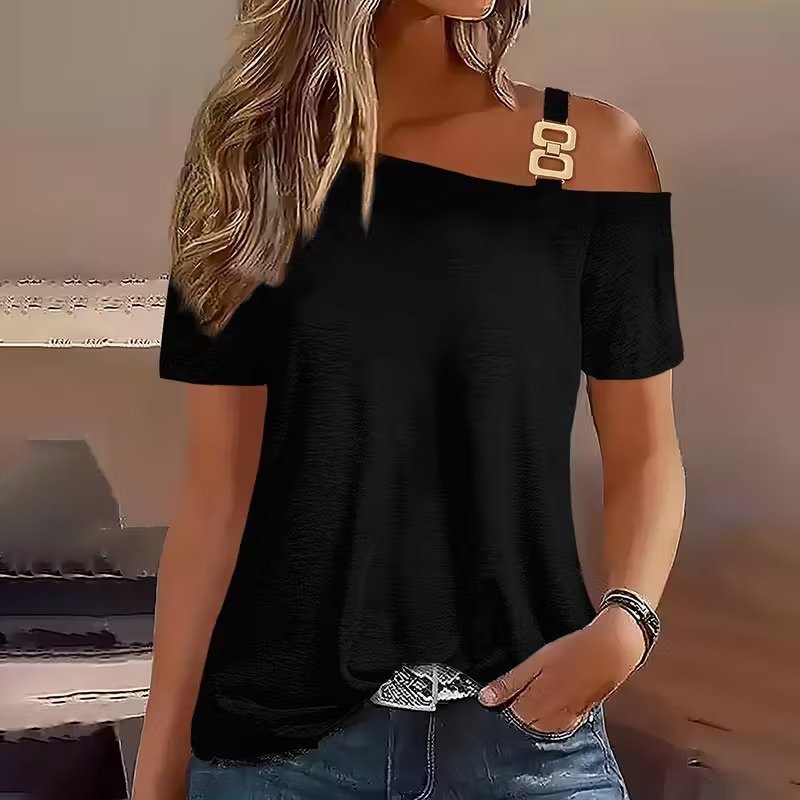 Kadın Kısa Kollu Tek Omuzu Açık Askı Toka Detaylı Viskon Bluz
