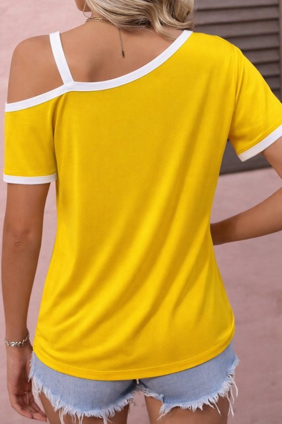 Kadın Kısa Kollu Tek Omuzu Açık Askı Toka Detaylı Viskon Bluz Modelin Ölçüleri: Boy:165, Kg:55, Göğüs:90, Bel:72, Kalça: 100 Modelin üzerindeki ürün M/38 bedendir DESEN-DiğerleriKALIP-Klasik