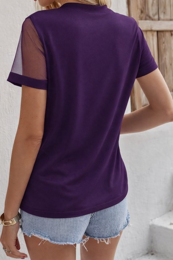 Kadın Kısa Kollu Tül Detaylı Taşlı Janjan Krep Bluz
