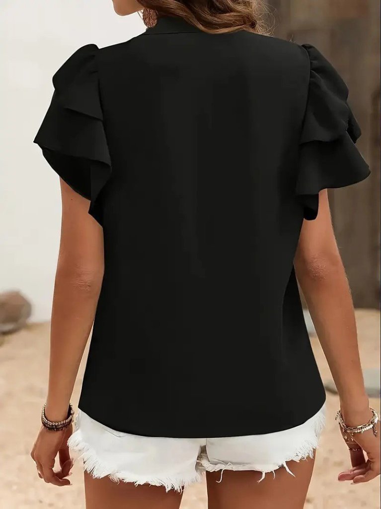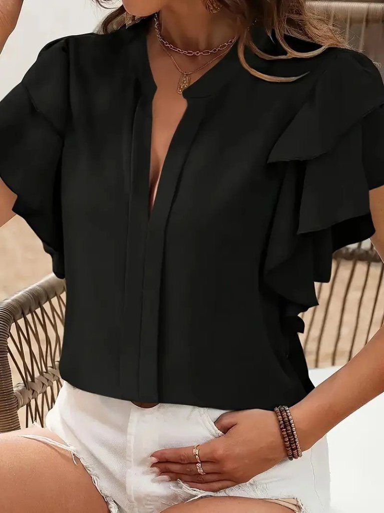 Kadın Kısa Kollu V Hakim Yaka Kolları Fırfırlı Dubai Bluz Modelin Ölçüleri: Boy:165, Kg:55, Göğüs:90, Bel:72, Kalça: 100 Modelin üzerindeki ürün M/38 bedendir DESEN-DiğerleriKALIP-Klasik
