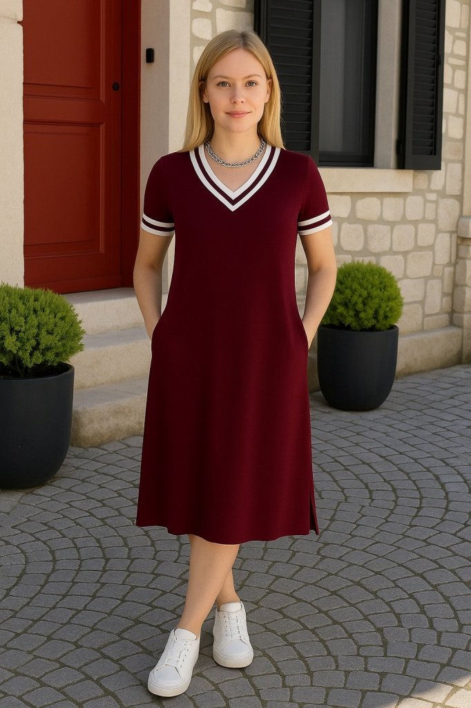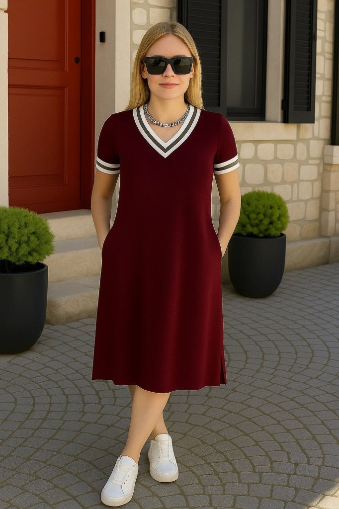 Kadın Kısa Kollu V Yaka Ve Yaka Ribana Detay Midiboy Viskon Elbise