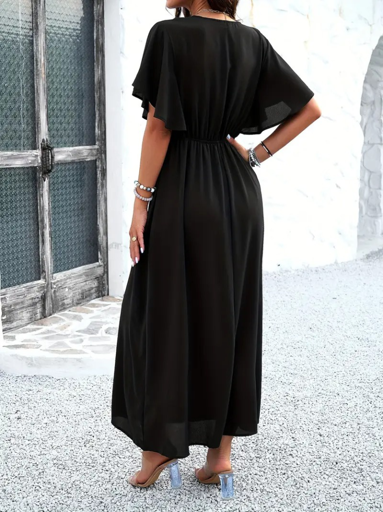 Kadın Kısa Kollu V Yakalı Beli Lastikli Uzun Viskon Elbise
