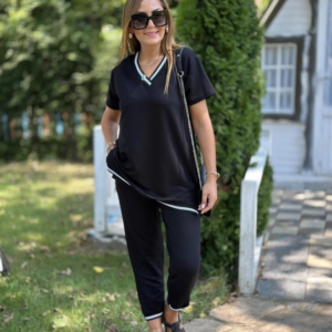 Kadın Kısa Kollu V Yakalı Iki Iplik Bluz Ve Pantolon Ikili Takım