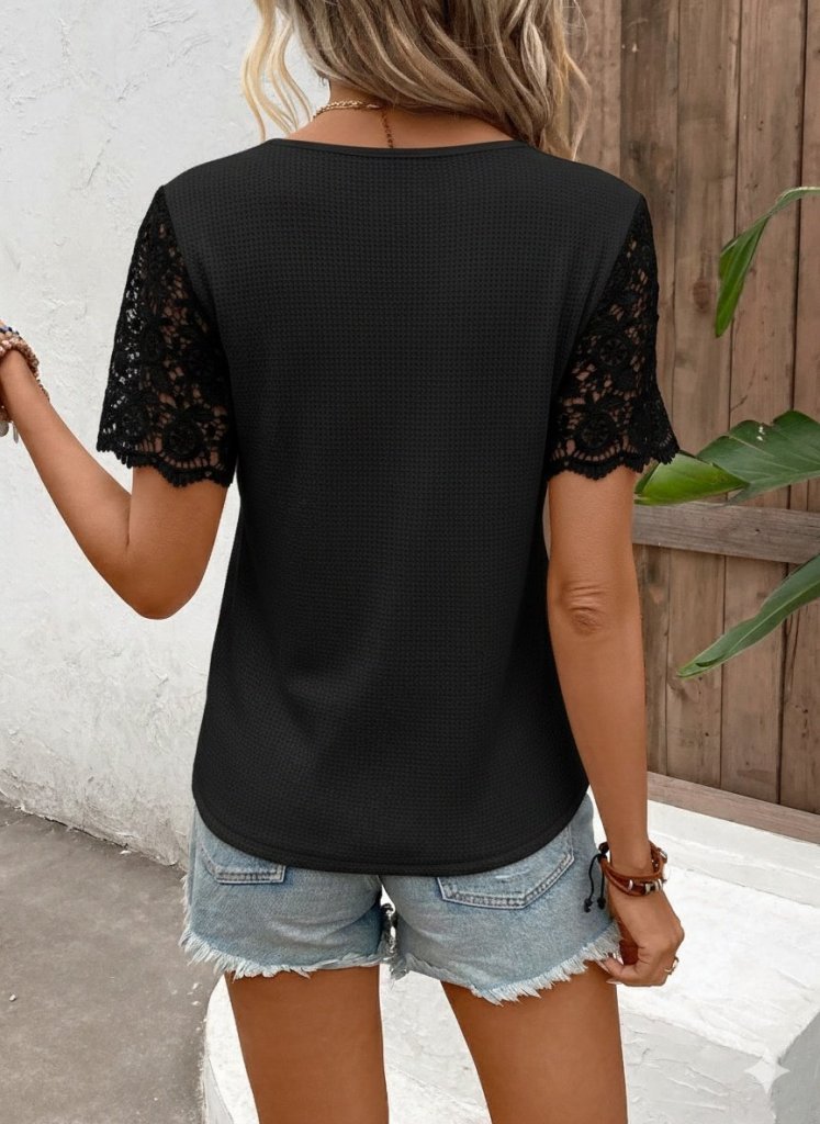 Kadın Kısa Kollu V Yakalı önden Düğmeli Dantel Detaylı Waffle Bluz Modelin Ölçüleri: Boy:165, Kg:55, Göğüs:90, Bel:72, Kalça: 100 Modelin üzerindeki ürün M/38 bedendir DESEN-DiğerleriKALIP-Klasik