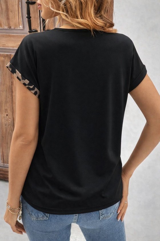 Kadın Kısa Kollu Asimetrik Kesim V Detaylı Leopar Desenli Viskon Bluz