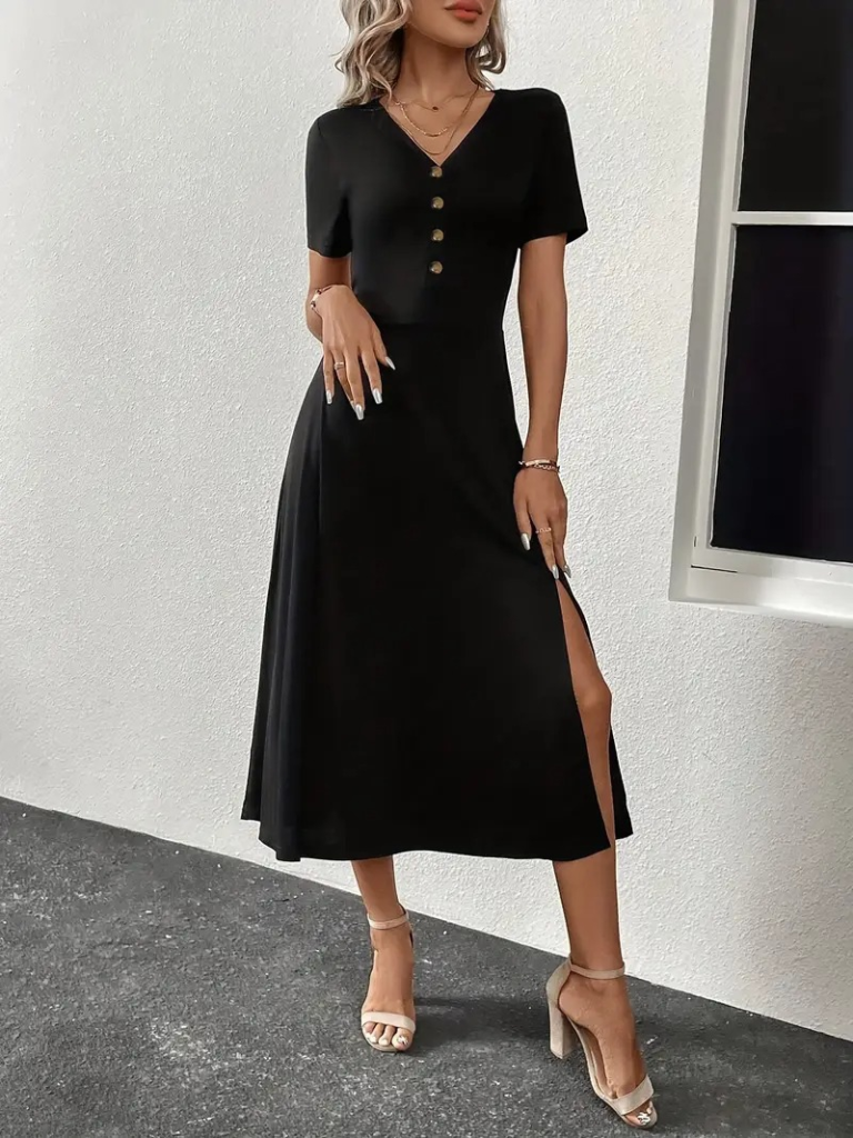 Kadın Kısa Kollu V Yakalı önden Düğmeli Yırtmaçlı Midi Viskon Elbise