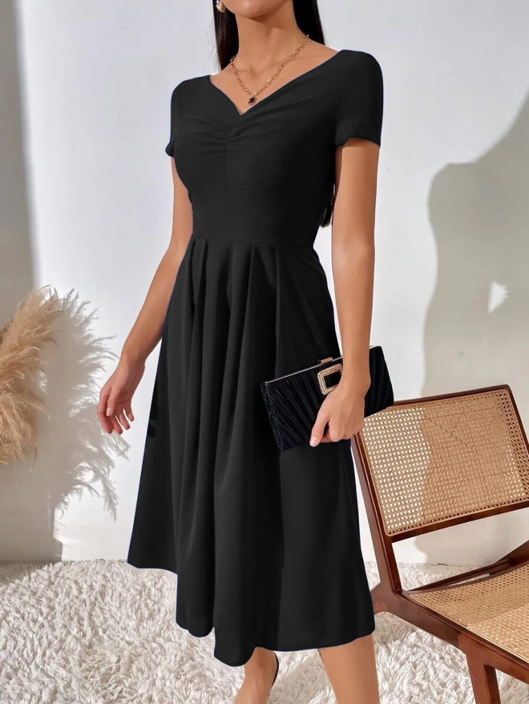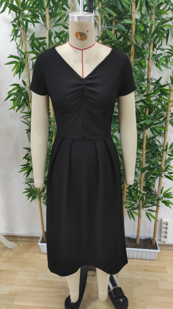 Kadın Kısa Kollu V Yakalı önden Pileli Janjan Krep Elbise
