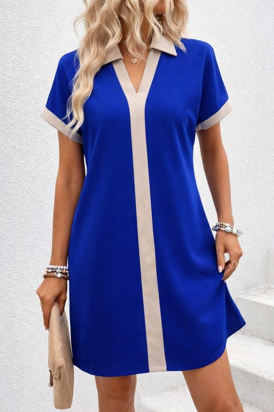 Kadın Kısa Kollu V Yakalı Onden şerit Detaylı Yakalı Kısa Janjan Krep Elbise
