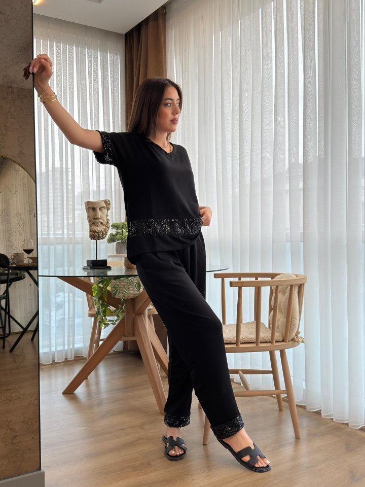 Kadın Kısa Kollu V Yakalı Pul Payetli Viskon Iki Iplik Bluz Ve Pantolon Ikili Takım