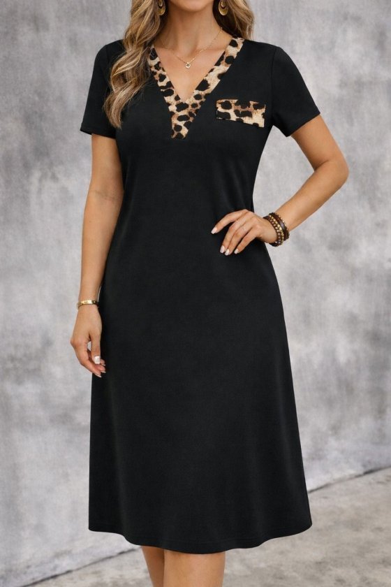 Kadın Kısa Kollu V Yakalı Süs Cep Detaylı Midi Viskon Elbise
