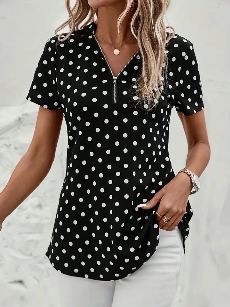 Kadın Kısa Kollu Yakadan Fermuarlı Puantiyeli Uzun Dokuma Viskon Bluz Modelin Ölçüleri: Boy:165, Kg:55, Göğüs:90, Bel:72, Kalça: 100 Modelin üzerindeki ürün M/38 bedendir KALIP-KlasikDESEN-Puantiyeli