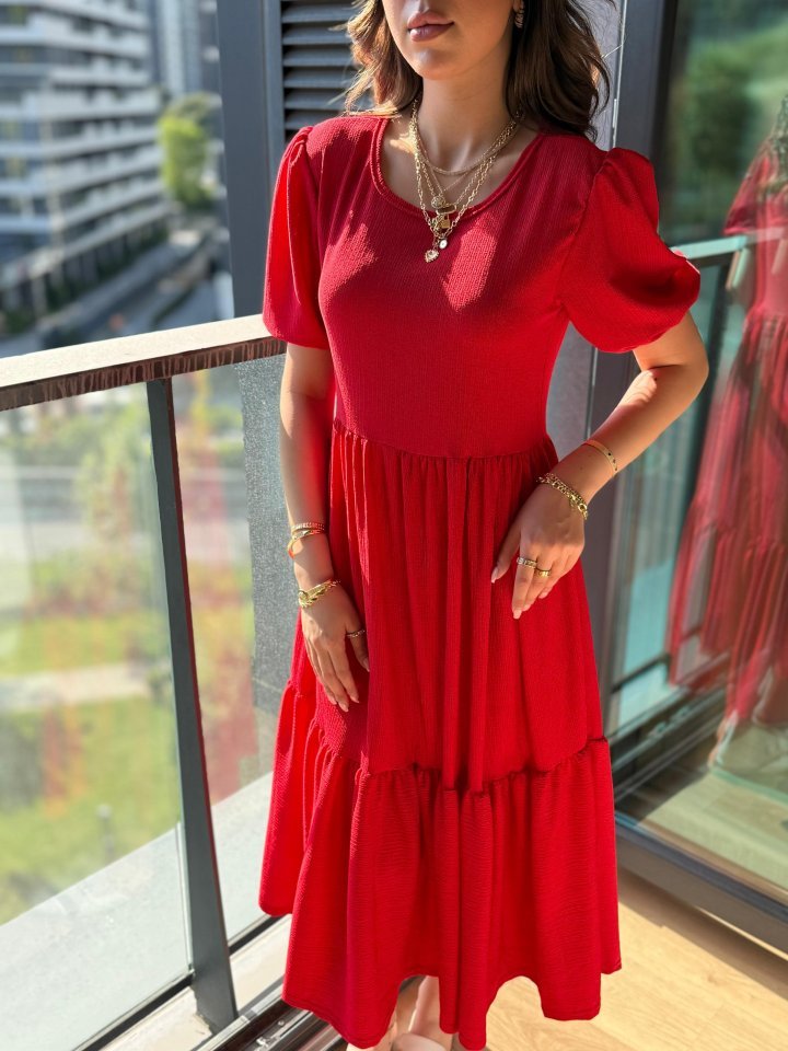 Kadın Kısa Kollu Yakası Açık Katlı Bürümcük Balon Elbise