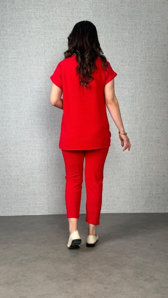 Kadın Kısa Kollu V Yakalı Iki Iplik Bluz Ve Pantolon Ikili Takım