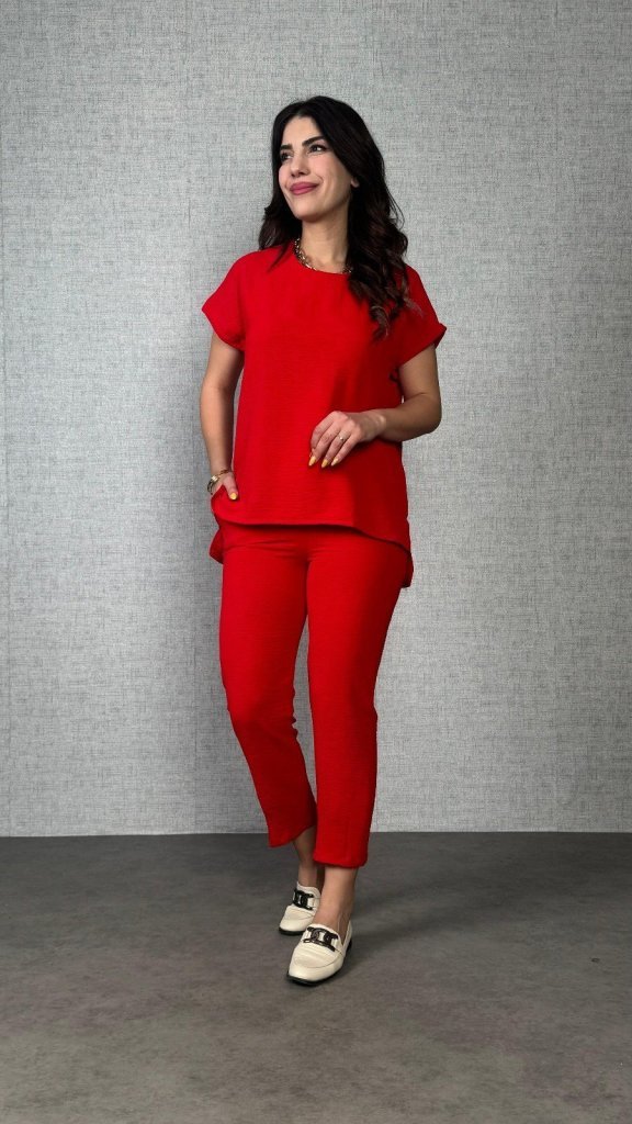 Kadın Kısa Kollu V Yakalı çift Renkli Viskon Iki Iplik Ikili Bluz Ve Pantolon Takım