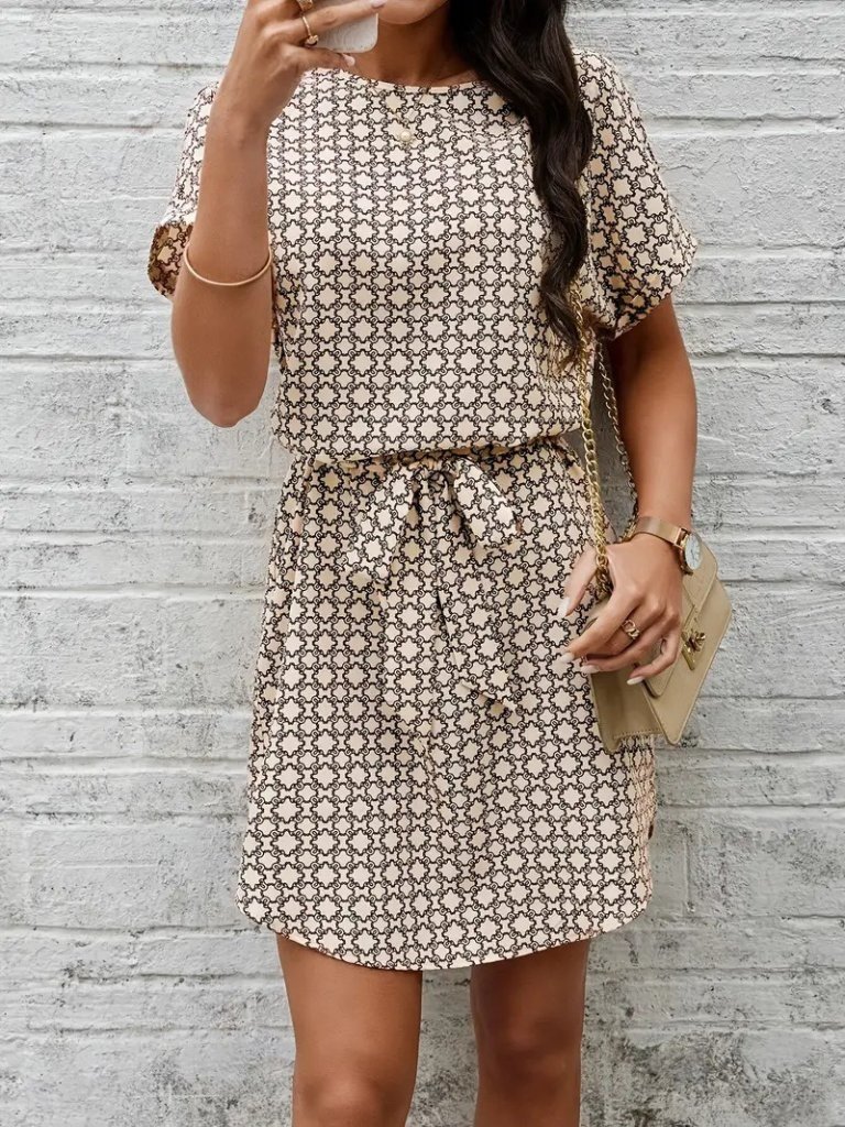 Kadın Kısa Kollu Yuvarlak Yaka Beli Kuşaklı Geometrik Desenli Süprem Elbise