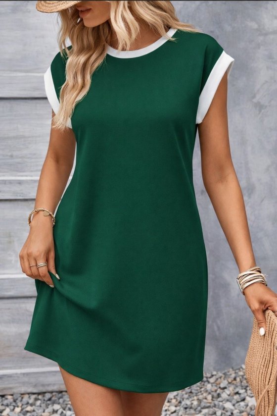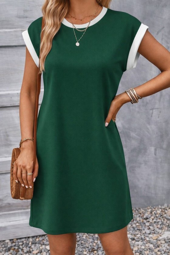 Kadın Kısa Kollu Yuvarlak Yakalı Kontrast Manset Detaylı Kısa Janjan Krep Elbise