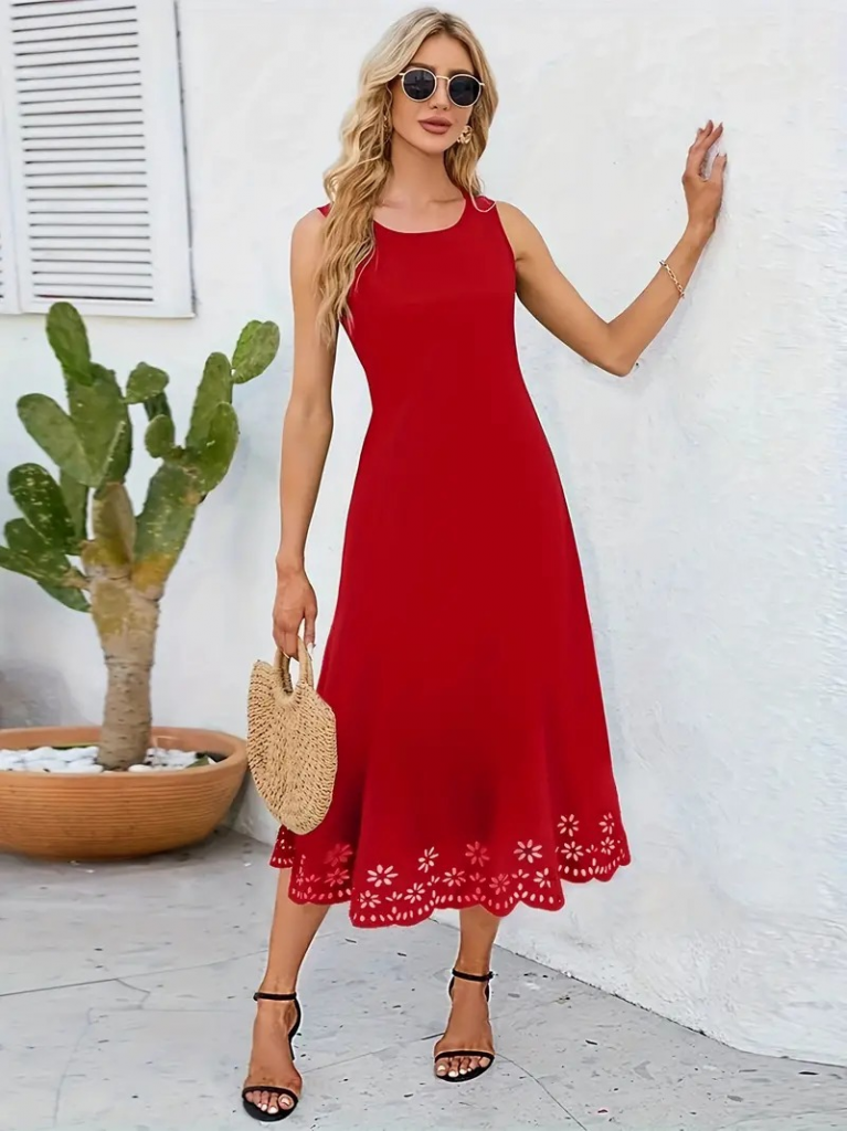 Kadın Kolsuz Etek Ucu Lazer Kesim çiçek Desenli Midi Boy Ithal Krep Elbise