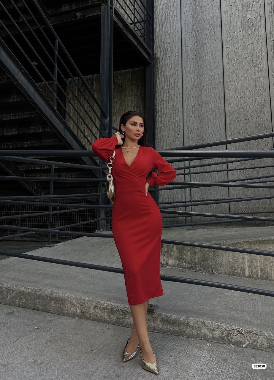 Kadın Kruvaze Yaka Balon Kol Simli Krep Kumaş Midi Boy Elbise