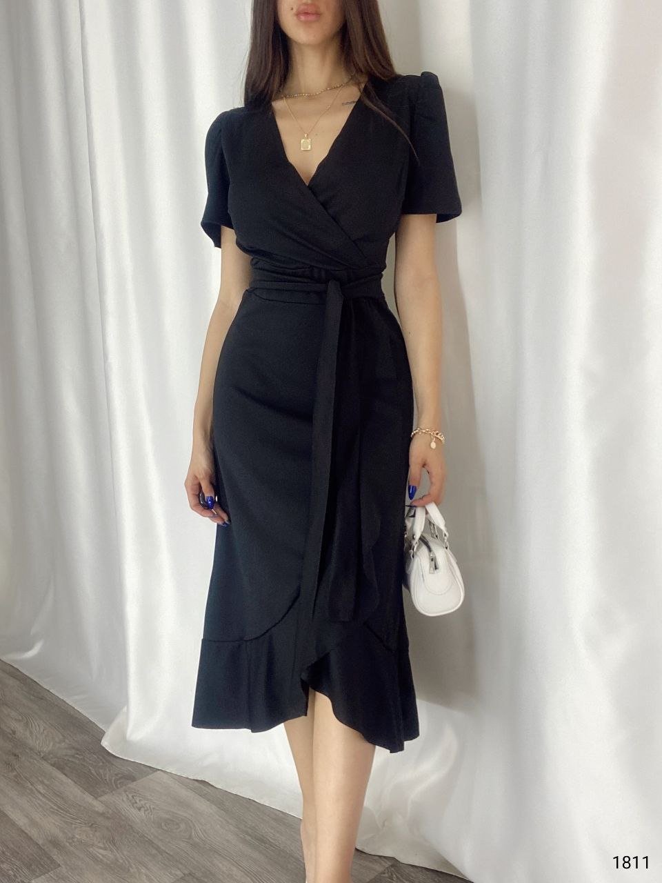 Kadın Kruvaze Yaka Midi Boy Kuşaklı Krep Elbise 120 Cm Modelin Ölçüleri: Boy:165, Kg:55, Göğüs:90, Bel:72, Kalça: 100 Modelin üzerindeki ürün M/38 bedendir EK OZELLIKLER-Eteği FırfırlıKAPATMA TURU-KapanmiyorTARZ-ElegantUZUNLUK-Midi BoyYAKA-KruvazeDESEN-Desensiz/DüzKOL UZUNLUK-Kısa KolTARZ-KokteylKALIP-Düz/Desensiz