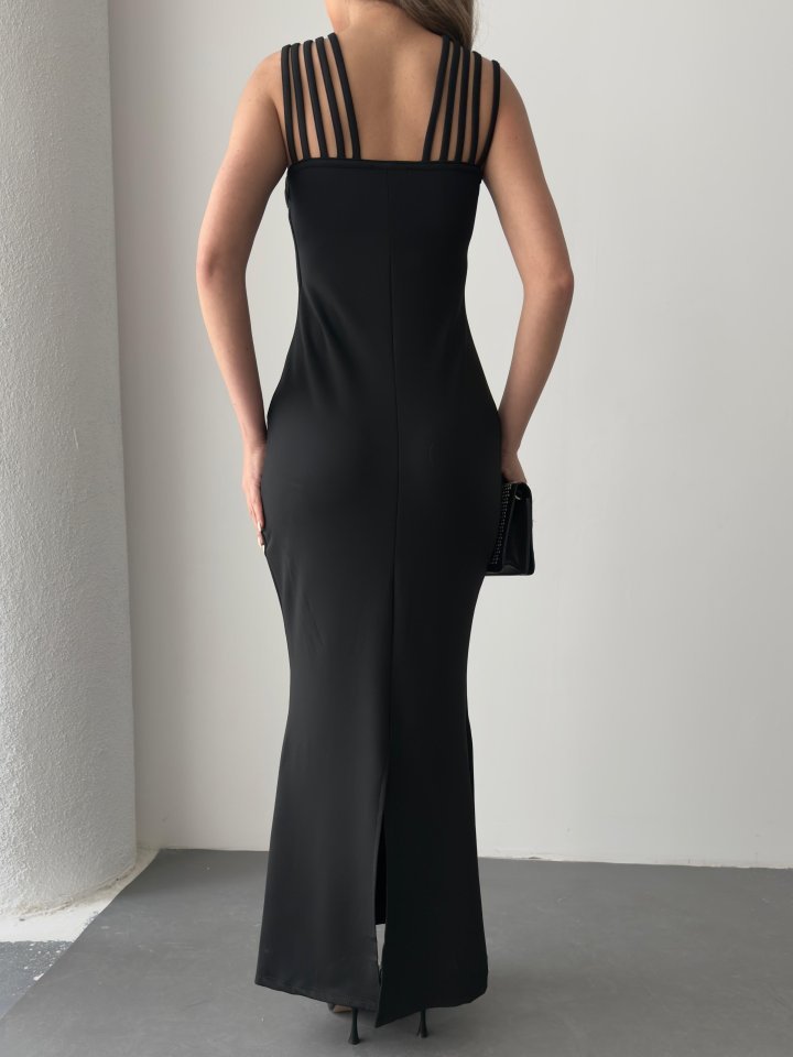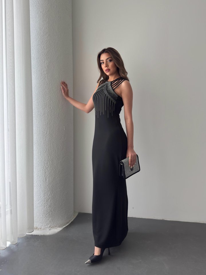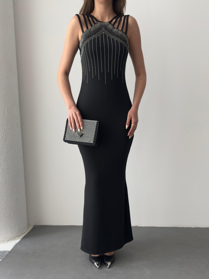 Kadın Omuz çoklu Askılı önü Taş Işlemeli Balık Kesim Janjan Krep Maxi Boy Elbise