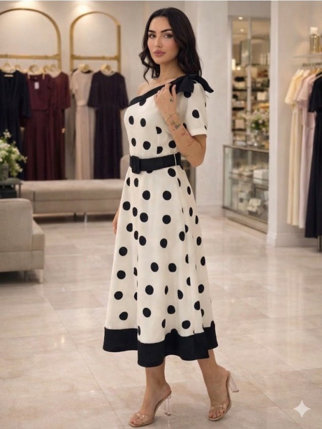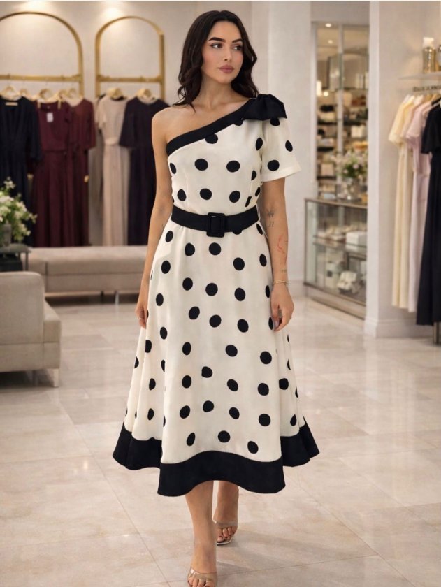 Kadın Omuz Dekolteli Fiyonk Ve Puantiye Detay Maxi Boy Elbise