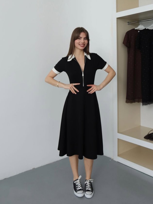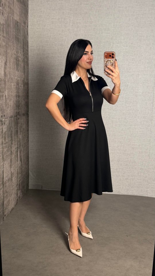 Kadın Polo Yaka Fermuar Detaylı Modal Midi Elbise Modelin Ölçüleri: Boy:165, Kg:55, Göğüs:90, Bel:72, Kalça: 100 Modelin üzerindeki ürün M/38 bedendir