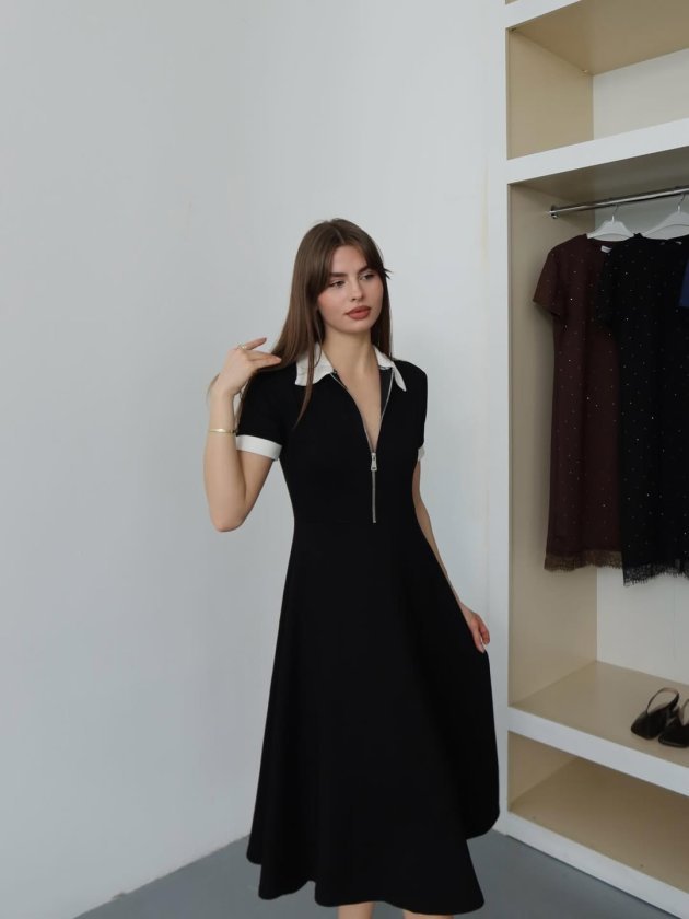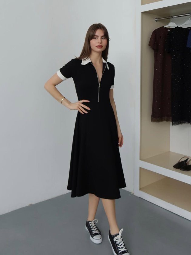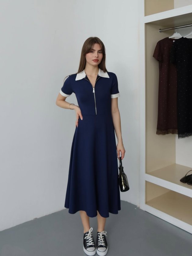 Kadın Polo Yaka Fermuar Detaylı Modal Midi Elbise
