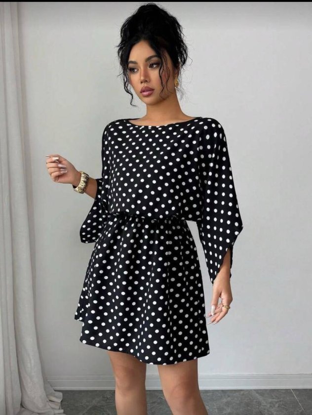 Kadın Puantiyeli örme Krep Mini Elbise (kemersiz) Modelin Ölçüleri: Boy:165, Kg:55, Göğüs:90, Bel:72, Kalça: 100 Modelin üzerindeki ürün M/38 bedendir