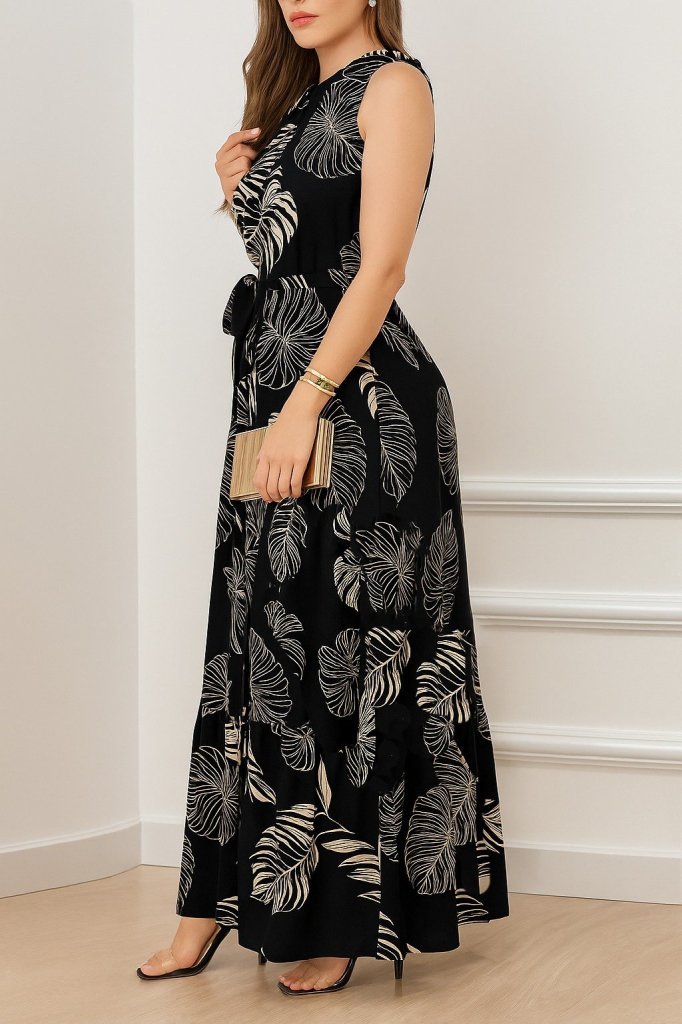 Kadın Askılı Yakası Fırfırlı Bağcıklı Desenli Uzun Süprem Elbise