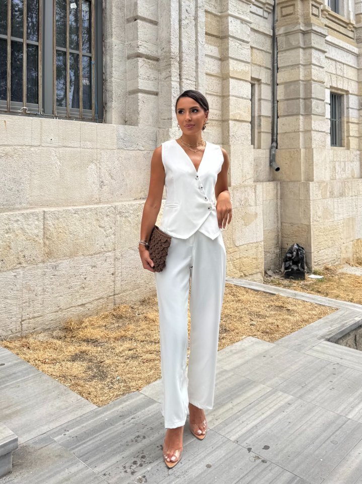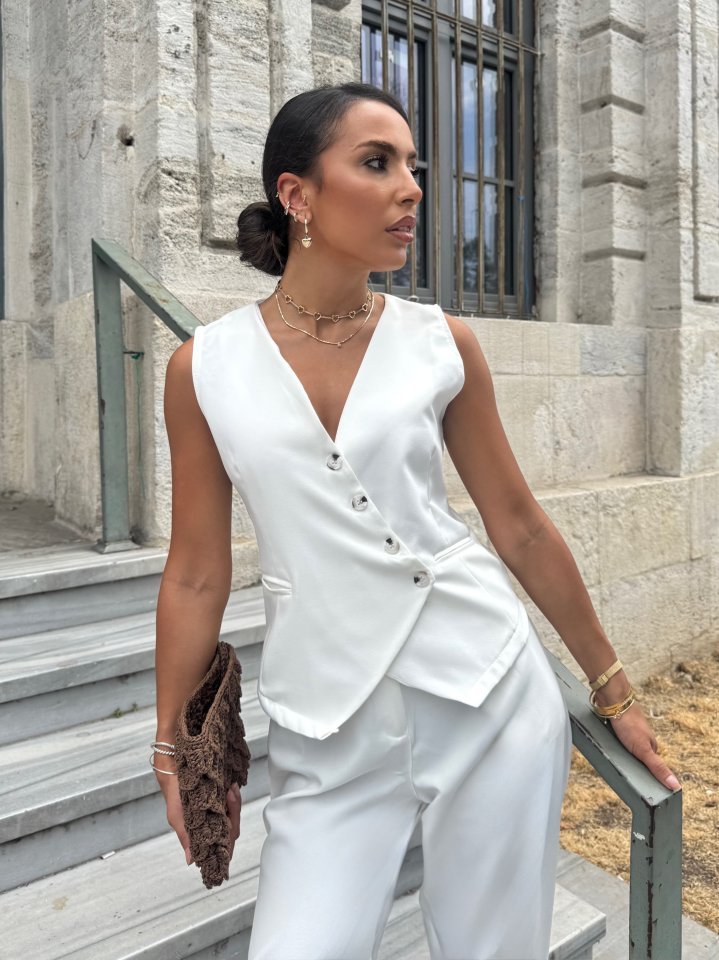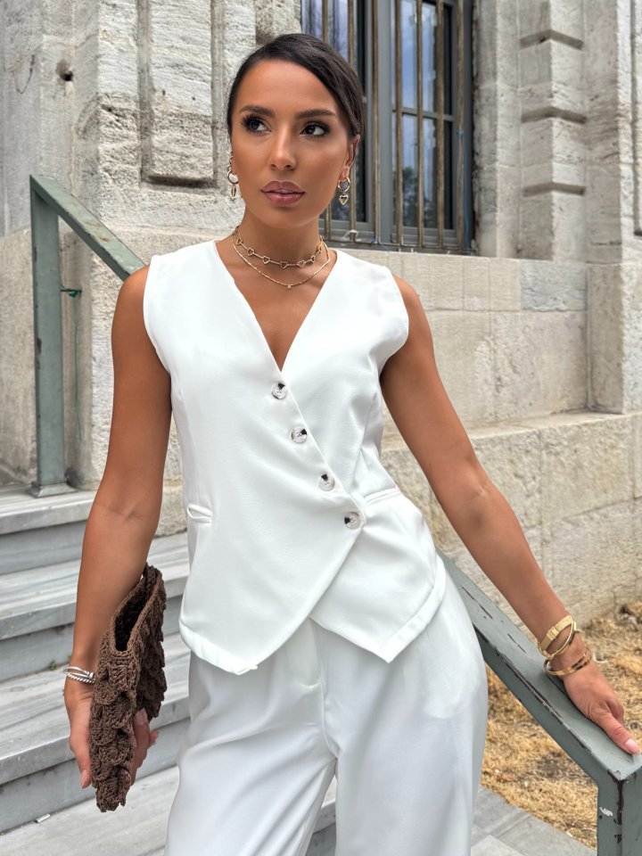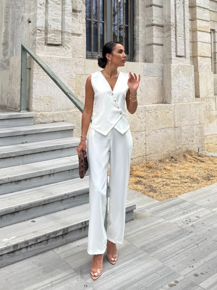 Kadın Sıfır Kollu çapraz V Yakalı önden Düğmeli Atlas Yelek Ve Pantolon Ikili Takım Modelin Ölçüleri: Boy:165, Kg:55, Göğüs:90, Bel:72, Kalça: 100 Modelin üzerindeki ürün M/38 bedendir KOL UZUNLUK-KolsuzTAKIM OZELLIK-Pantolonlu…