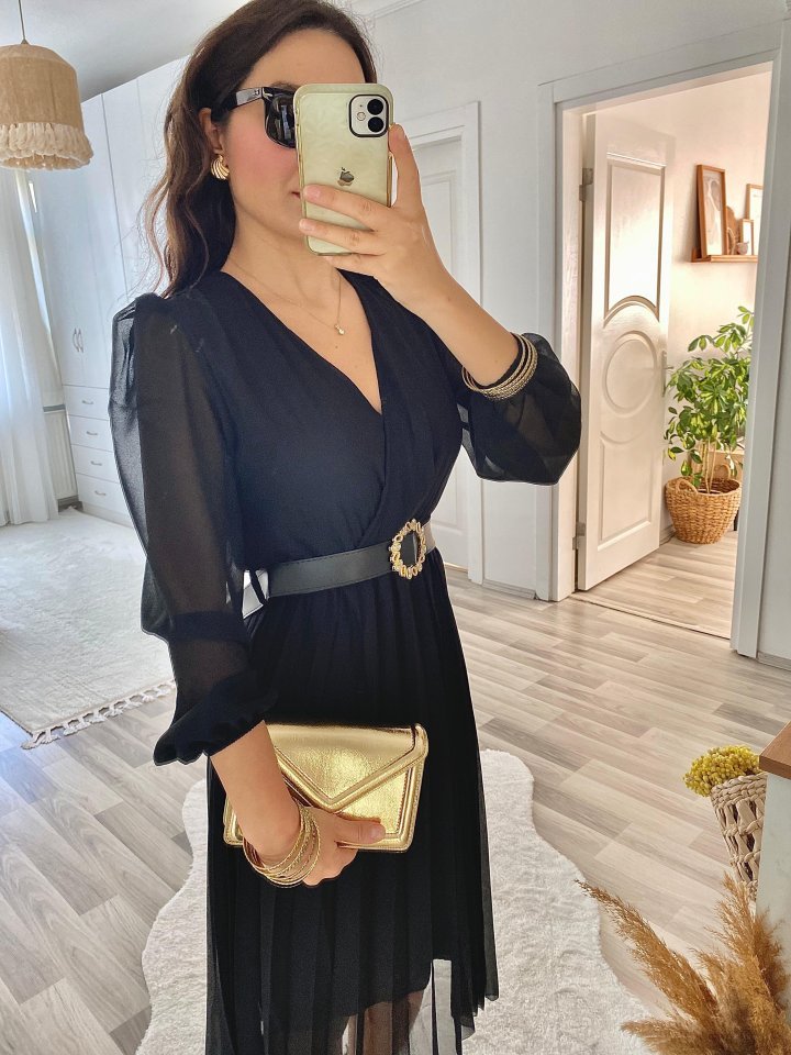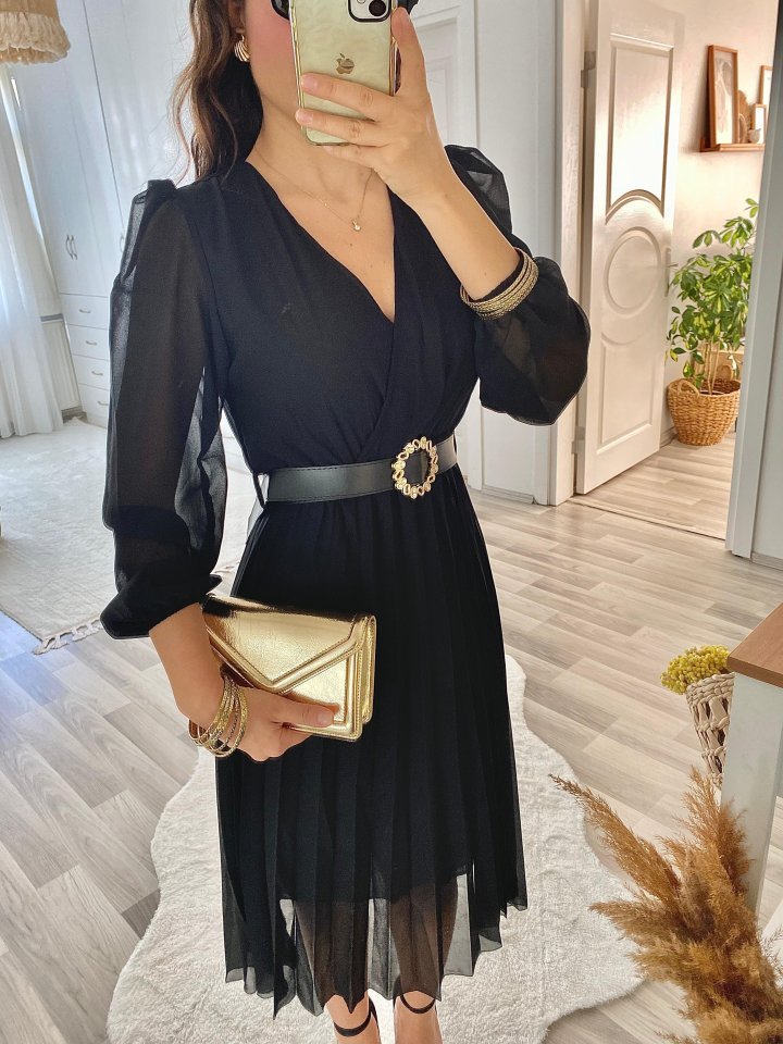 Kadın şifon Kumaş Astalı Kloş Kesim Kruvaze Yaka Midi Boy Elbise