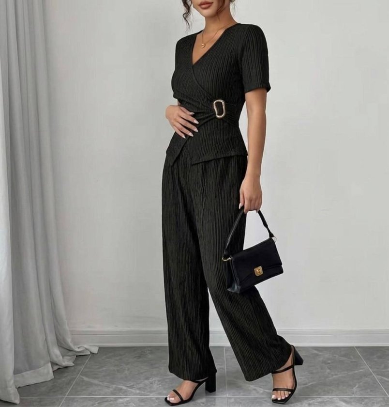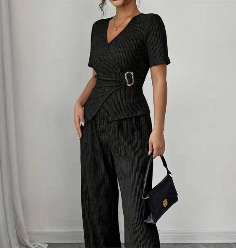Kadın Kısa Kollu V Yakalı Iki Iplik Bluz Ve Pantolon Ikili Takım